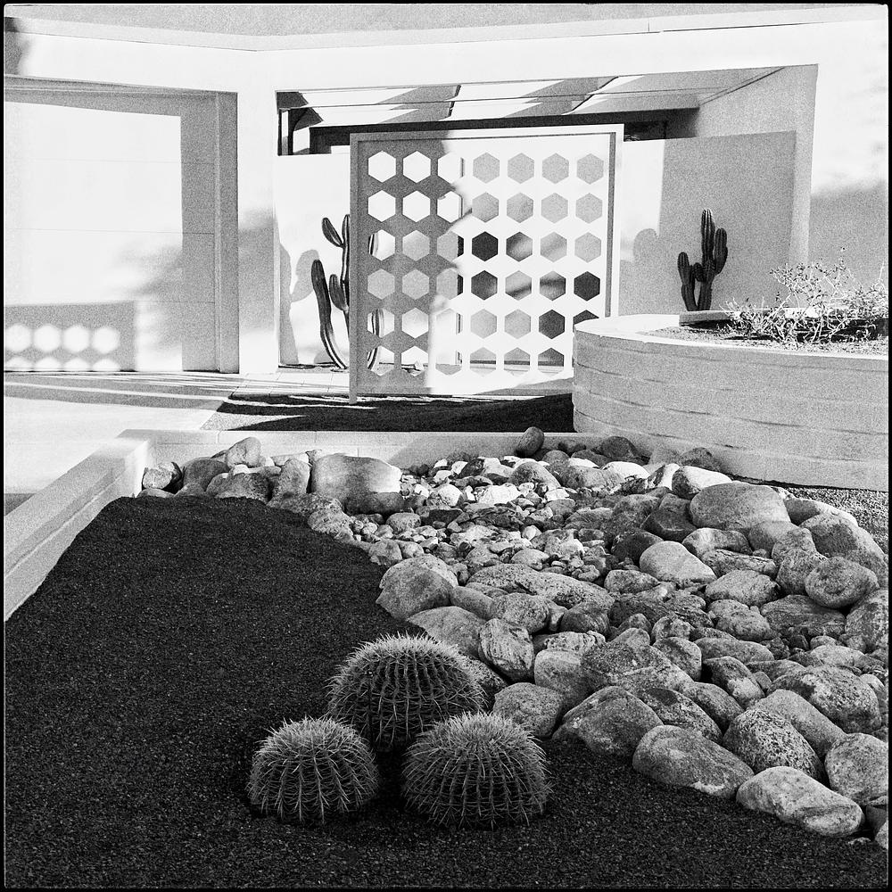 The play of light and shadow accentuates the textures and forms, enhancing the dramatic impact of this composition. In this desert tableau, the Barrel Cactus and octagon breeze block come together, creating a compelling narrative of nature, design, and architectural contrast against the pure canvas of the white home.