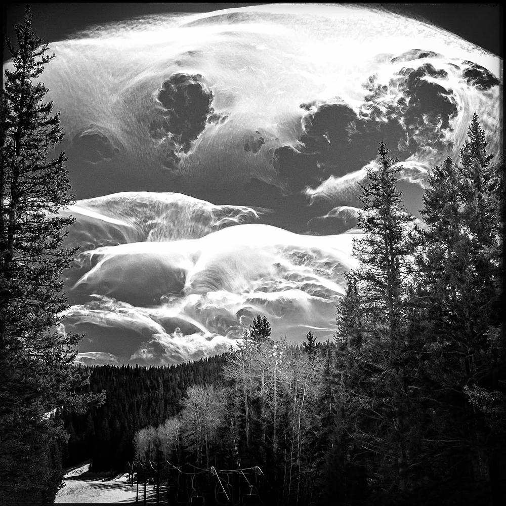 The play of light and shadow on the undulating clouds creates a dynamic and mysterious ambiance. Easy Street, typically a familiar pathway, becomes a magical journey into the unknown. The absence of color accentuates the contrasts, emphasizing the depth and texture of the clouds as they weave through the mountainous terrain.