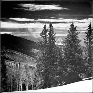 Step into a realm where the grandeur of winter mountains meets the subtle drama of nature's rebirth. Behold the captivating contrast of black and white hues, creating a symphony of visual delight. In the distance, witness the controlled blaze of a prescribed burn, a testament to land management practices that ensure safety while rejuvenating the landscape. Yet amidst this controlled chaos, the stoic presence of pine trees stands tall, serving as silent sentinels over the pristine snow below. Above, the sky is adorned with wisps of delicate clouds, adding an ethereal touch to the scene. This is more than just a moment captured; it's a frozen tableau of nature's quiet magnificence, where tranquility and transformation converge. Experience the serenity and wonder of winter mountains and embark on a journey of discovery through the silent majesty of the natural world.