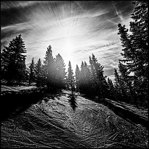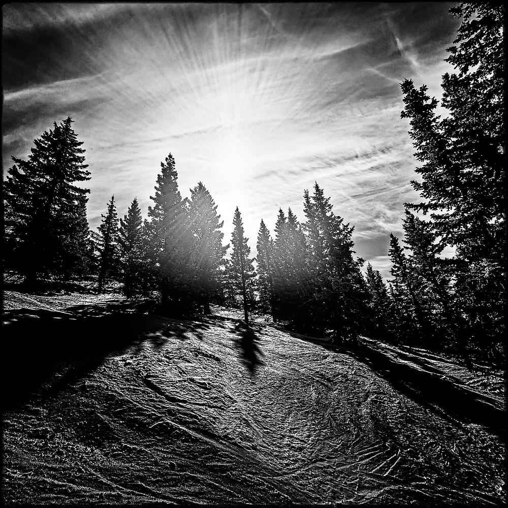 This captivating image was captured in black and white at Ski Santa Fe in Santa Fe, New Mexico, showcasing the breathtaking beauty of a sunburst amidst the trees. #skibueno